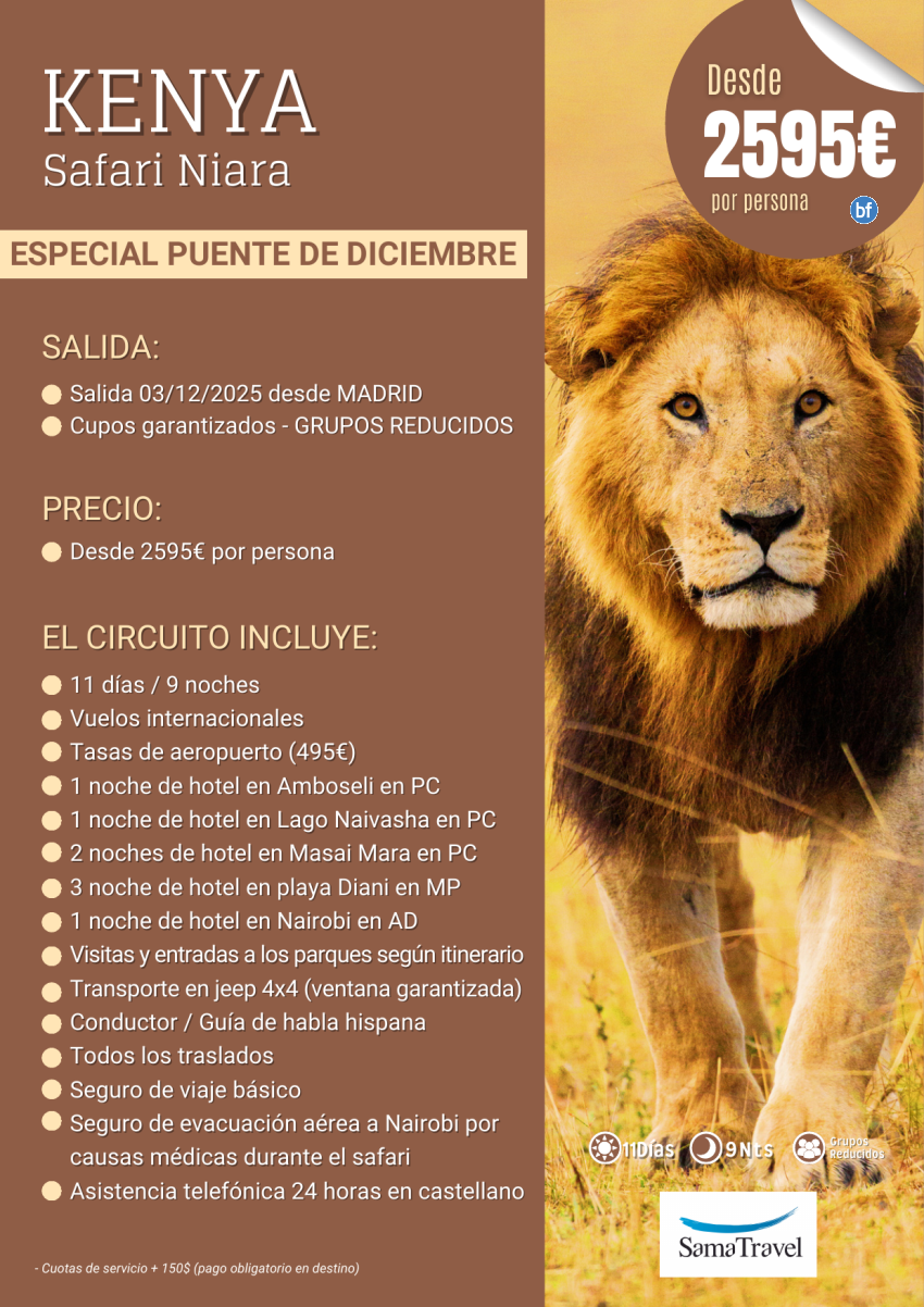 PTE DEC: Kenia "Safari Niara con Playa: Salida desde Madrid - 11 días con safaris y visitas **Desde 2.595€**