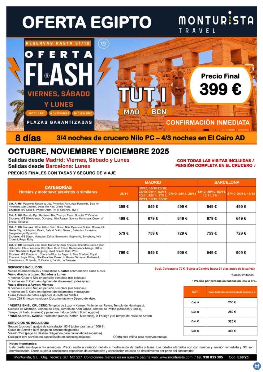 Oferta Flash®-TUT I***desde 399€-salida charter MAD vier,sab,lun BCN lun-Oct,Nov,Dec 3/4n crc+4/3n cai+visitas