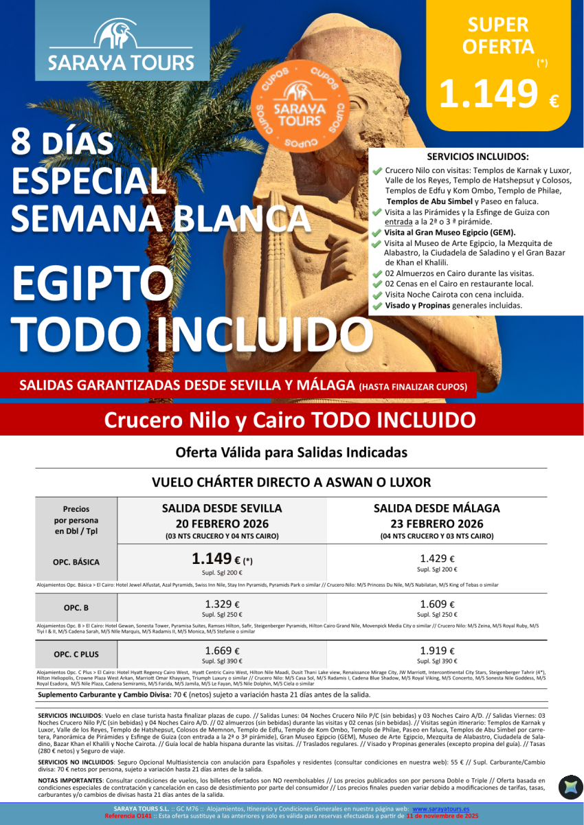 *NUEVO*Especial Semana Blanca Egipto Todo incluido. Salida Sevilla y Málaga. Crucero y Cairo con visitas y más