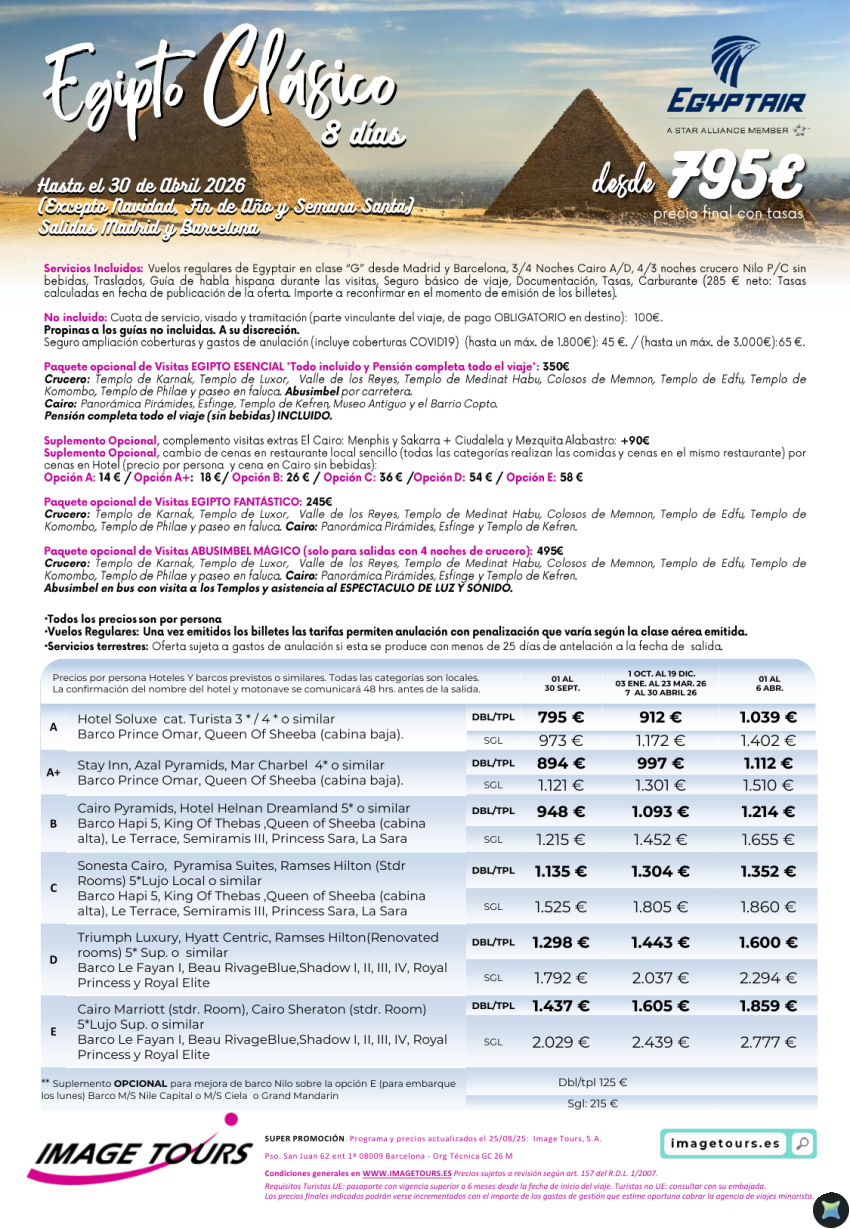 Egipto Clásico 8 días hasta abril 2026 desde 795€ en vuelo regular, con Crucero Nilo y Cairo