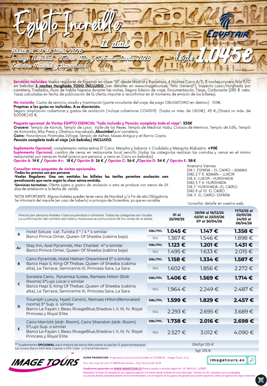 Egipto Increíble hasta abril 2026, 11 días con Cairo AD, Crucero Nilo PC y Hurghada Todo Incluido. Desde 1045€