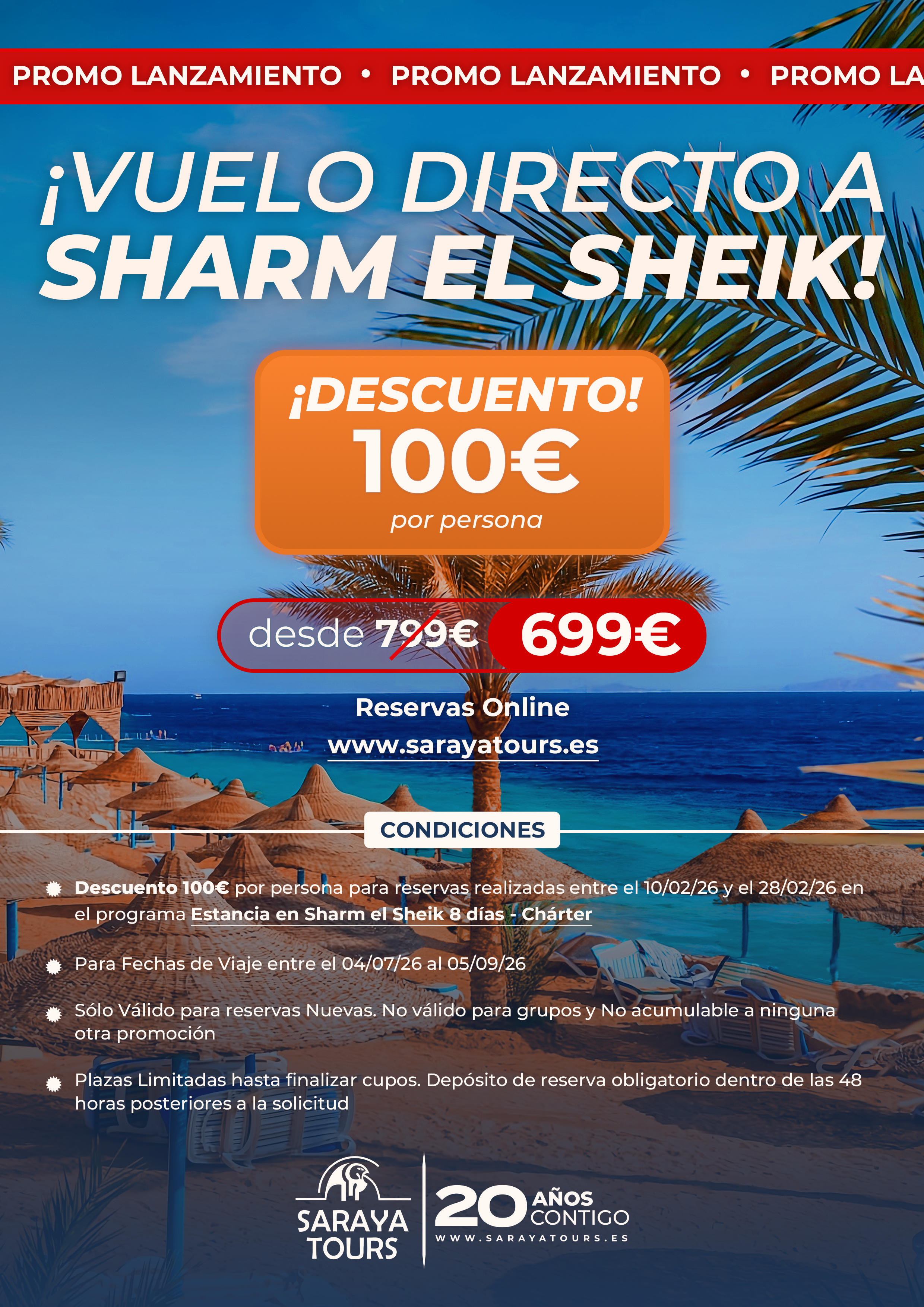 📢 Promo Lanzamiento Vuelo SHARM * Descuento 100 € p.persona * Salidas 04/07 a 05/09. Consultar condiciones.