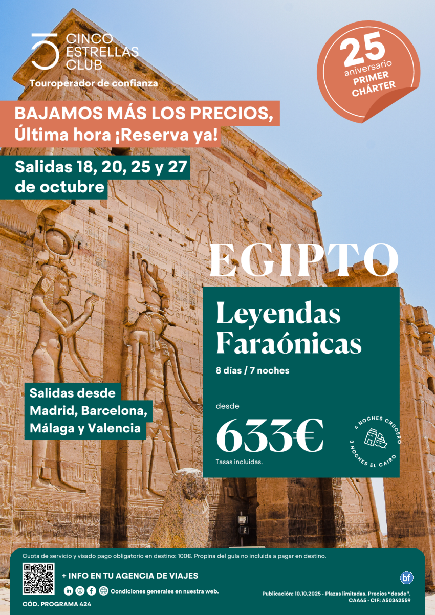 Bajamos más los precios Leyendas Faraóniocas 8ds/7n dsd 633€ sal. 18,20,25 27 de octubre dsd Mad, Bcn,Agp,Vlc