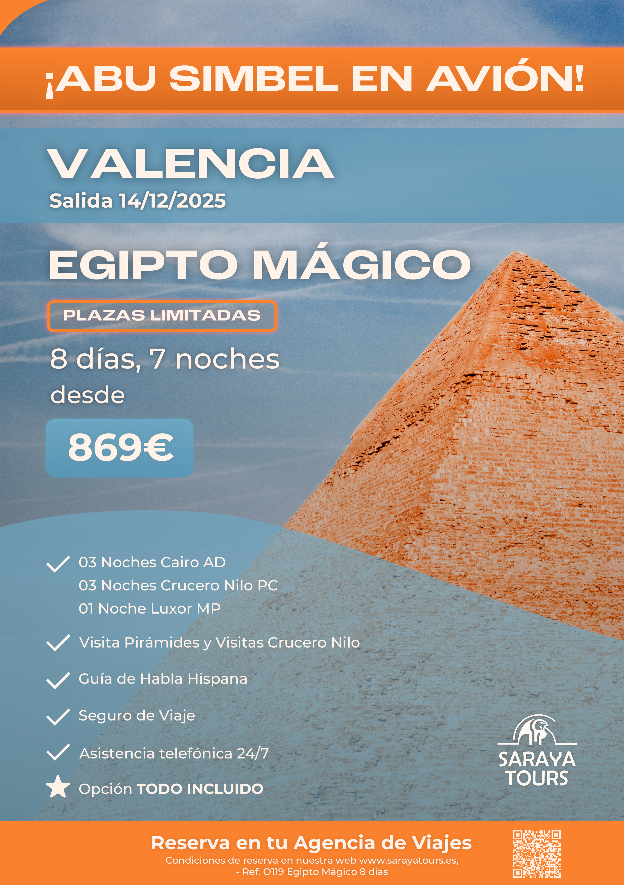 Salida Valencia 14/12/25 ¡Últimas Plazas! Egipto Mágico con Abu Simbel en Avión incluido