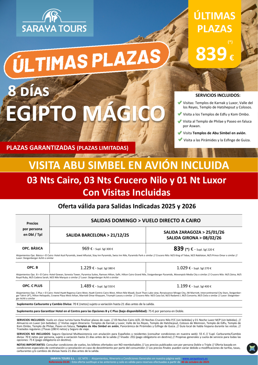 Últimas Plazas Egipto Mágico con Abu Simbel en avión Incluido. Consultar fechas.