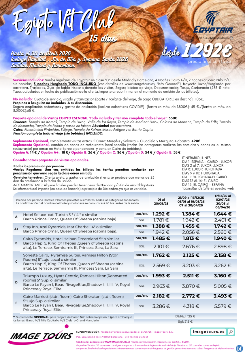 VIT Club hasta abril 2026, 15 días de viaje a Egipto desde 1.292€