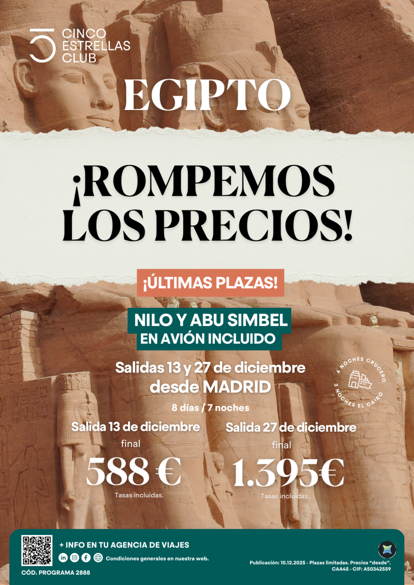 Rompemos precios!Últ.Plazas Nilo y Abu Simbel en avion incluido PVP 1.395€ sal. 27 diciembre desde Madrid