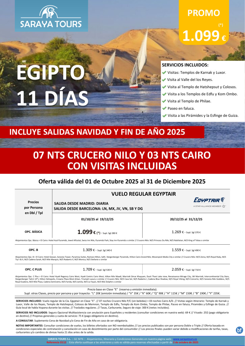 Egipto 11 días. Salidas Mad y Bcn *Crucero 7 noches y Cairo con Visitas Incluidas* dsd 109€ hasta Sept26