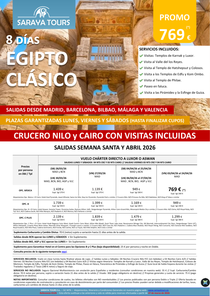 Egipto Clásico 8 días. Crucero y Cairo + visitas *Salidas Bcn, Mad ,Agp ,Bio & Vlc dsd 499€ * hasta Dic26