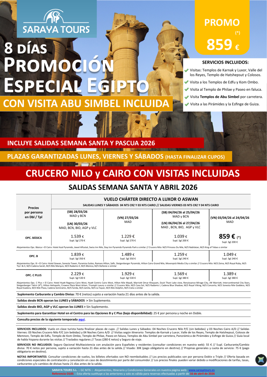 Promo Egipto con Abu Simbel 8días. Crucero y Cairo desde 599 €.*Salidas Mad, Bcn, Bio, Agp & Vlc* hasta Dec26